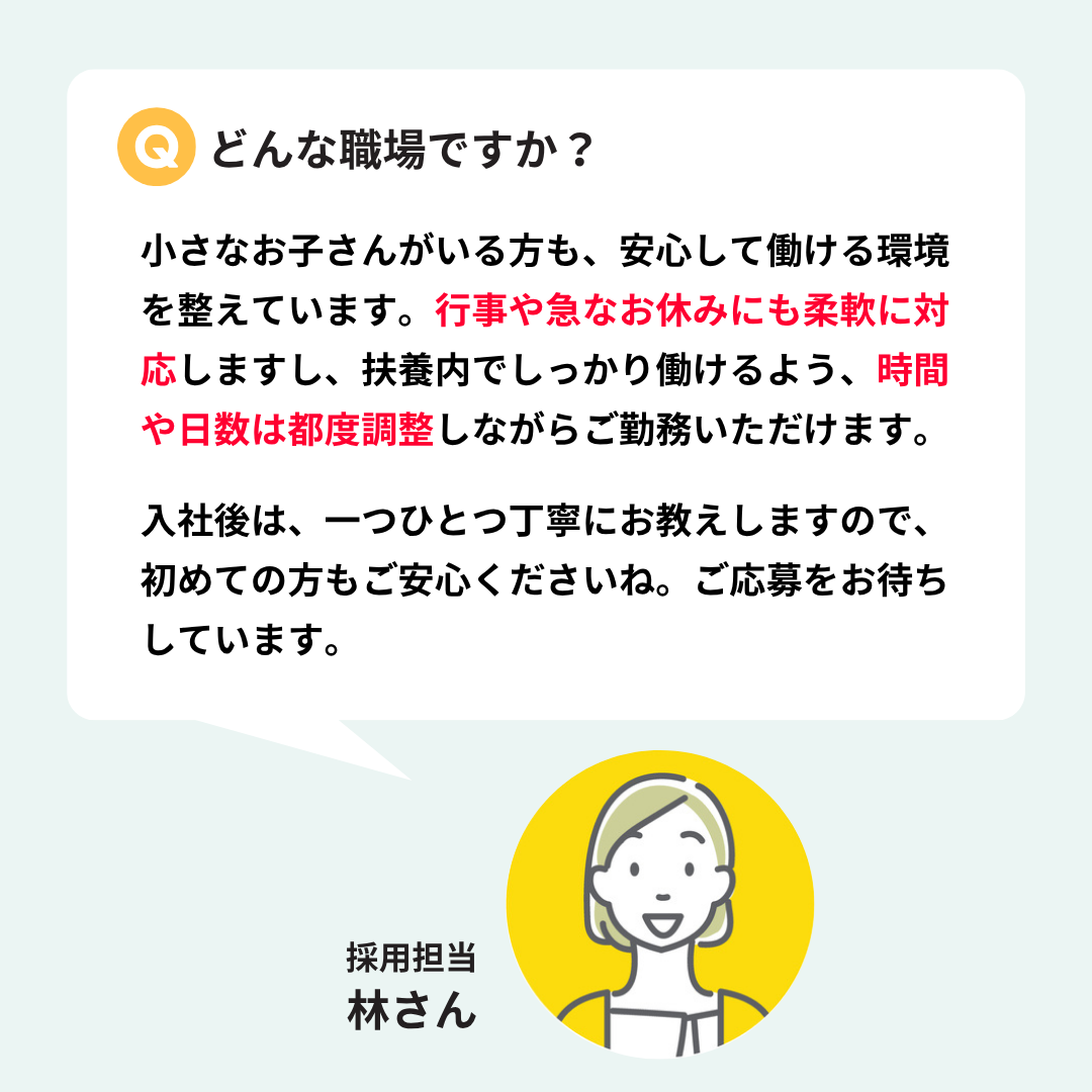 そんな時にも焦らず安心してお休みが取れる、子育て世代にやさしい職場です。- 実際に現在、子育て中のスタッフも活躍中!