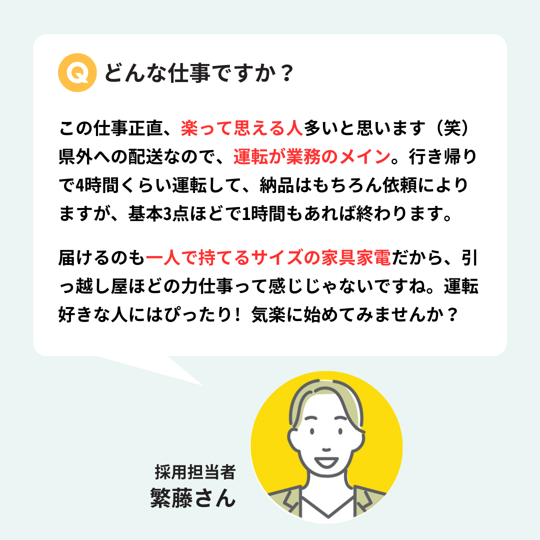 | 仕事内容 | 一人暮らし用の家具家電の配送と設置をお任せします。 【具体的には】 ・ワンボックスミニバンで家具家電を配送 ・配送先での設置作業 ・ベッドなどの組立て、家電の配線作業 *配送エリアは神奈川県、静岡県、長野県 *配送先は1日4~5件(繁忙期)または1~2件(閑散期)程度 *4月までの繁忙期は2人1組で配送します *納品作業は1時間程度 【将来的には】 個々の希望と適性を考慮し、キャリアアップの機会として、入社時の担当業務とは異なる仕事を担当する場合があります。(本人の希望がある場合のみ) <お友達と応募OK!> 面接が不安、友達と一緒に働きたい、など、アルバイト・パートの相談に応えます! |