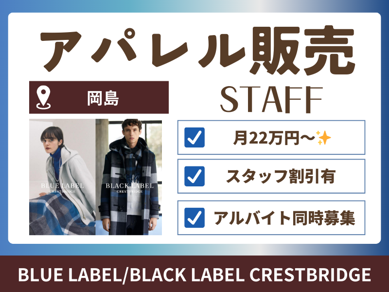 そんなあなたに、甲府市の岡島内【BLUE LABEL/BLACK LABEL CRESTBRIDGE】での販売スタッフのお仕事をご紹介します!
