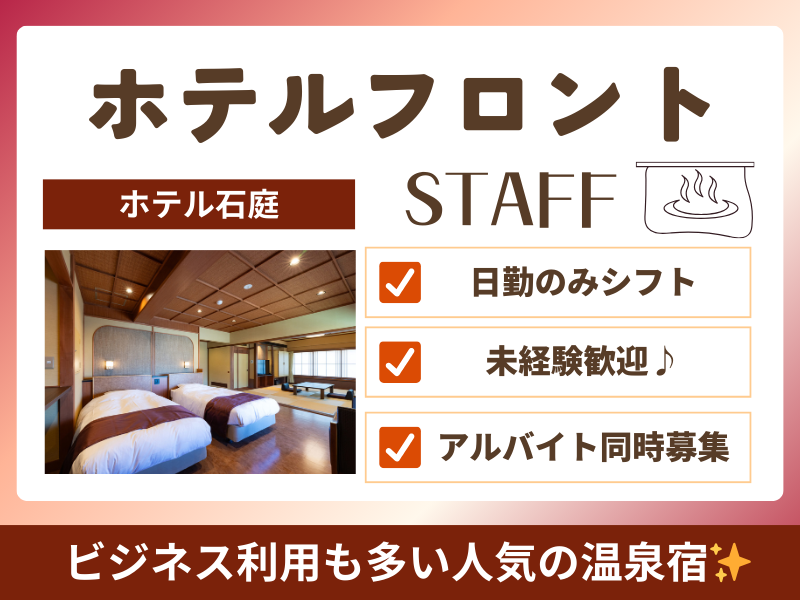 仕事内容 | ホテル石庭にて、フロント業務全般をお任せします。 【具体的には】 ・チェックイン・チェックアウトの対応 ・追加料金などの精算 ・電話対応(予約受付・問い合わせ対応など) ・簡単なPC入力業務 ・他部署(客室清掃・夕食準備等)のサポート *未経験の方も、教育担当がしっかりサポート! *人と関わることが好きな方にぴったりのお仕事です。 【将来的には】 個々の希望と適性を考慮し、キャリアアップの機会として、入社時の担当業務とは異なる仕事を担当する場合があります。(本人の希望がある場合のみ) |