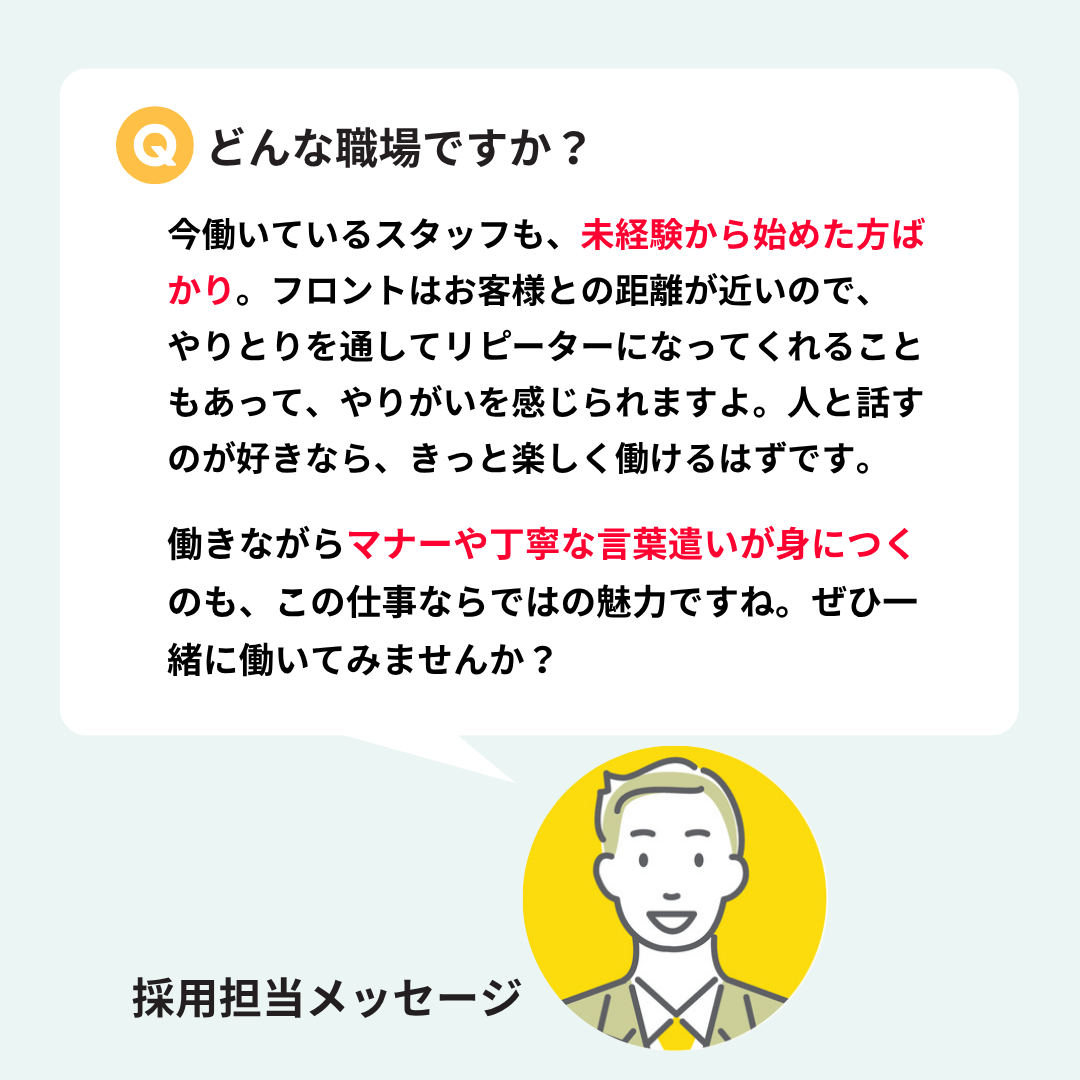 入社後は先輩スタッフがしっかりサポートするので、未経験でも安心。フロントに一人きりで立つことはなく、困ったときはすぐに相談できますよ。フロントだけでなく、清掃や食事のスタッフとも協力しながら、みんなでお客様をおもてなししています。チームで支え合える、あたたかい雰囲気の職場です。