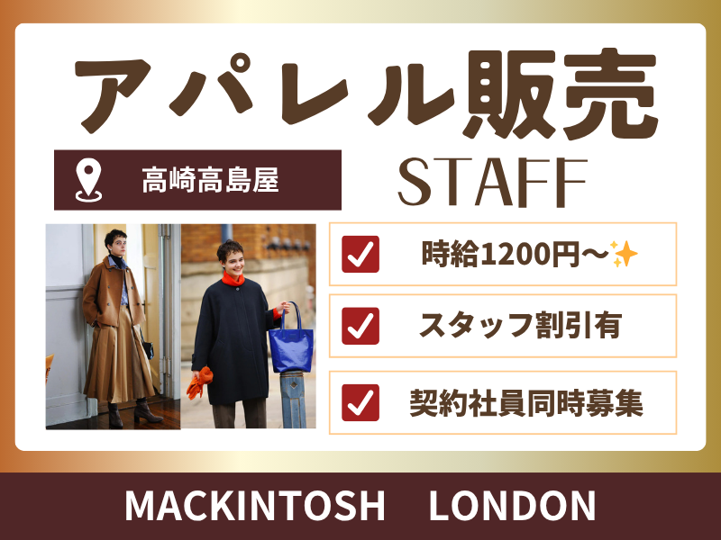 高崎高島屋に店舗を構える、【MACKINTOSH LONDON】のショップスタッフを大募集中です!
