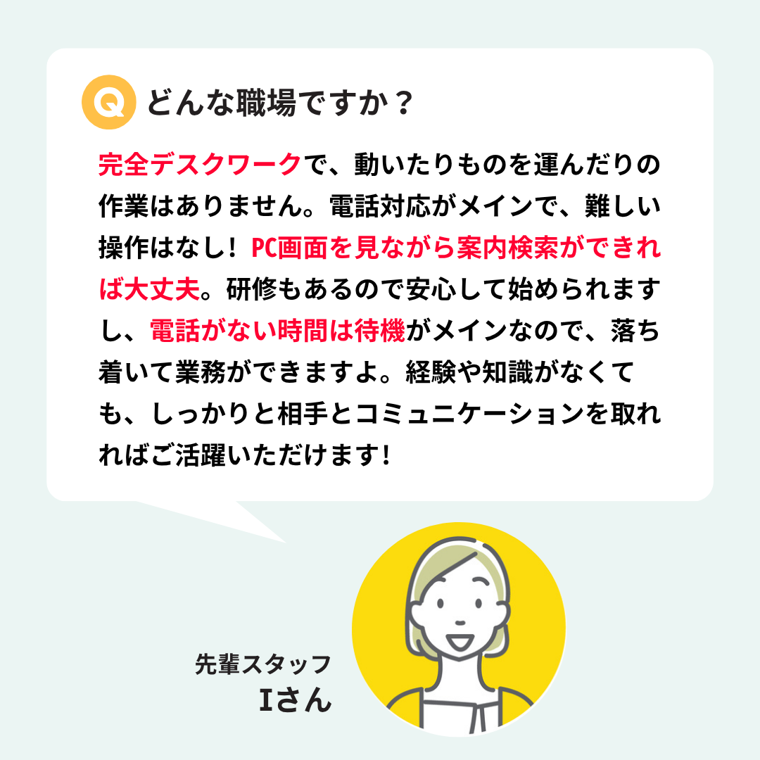 難しい判断や専門知識、特別なスキルは不要で、決まった手順に沿って進めるだけ。電話がない時間は、次の問い合わせに備えて待機。動き回ることがないため、体に負担の少ない完全デスクワークです。