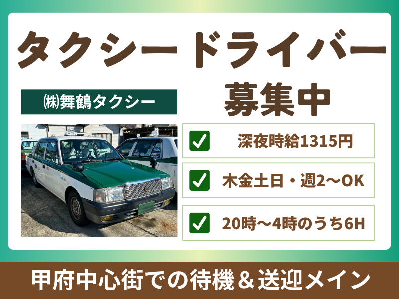 【株式会社舞鶴タクシー】夜間のみ! シニア活躍中のタクシードライバー【甲府市の求人】
