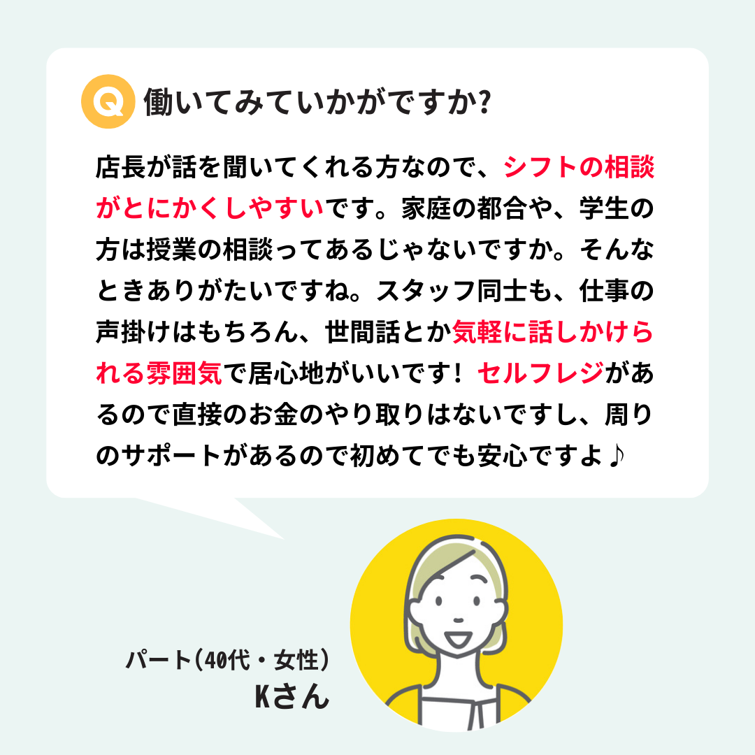 - 学生さんからWワーカーさんまで、自分のライフスタイルに合わせて働けるコンビニ♪