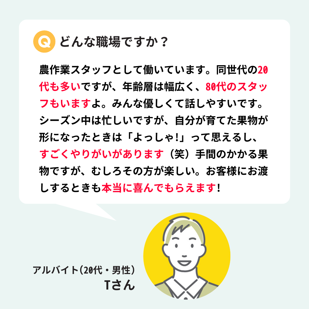 | 求める人材 | ▼農作業staff ・普通自動車運転免許(AT限定可)をお持ちの方 ・農業未経験の方も大歓迎! ▼事務staff ・経験問わず(観光ぶどう園やくだものに興味があれば尚よい) ・ご自身で通勤できる方 |