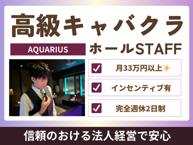 | 仕事内容 | 高級キャバクラのフロアで、ホールスタッフとしてお客様対応やドリンク作りなどを担当していただきます。 【具体的には】 ■お客様の受付・ご案内: ご来店のお客様を笑顔でお迎えし、席までご案内します。おしぼりを渡すなどのサービスも行います。 ■注文取り・提供: お客様からの注文を伺い、簡単なドリンク(ビール、焼酎、カクテルなど)を作って提供します。 ■キャストマネージメント(キャリアアップ後): キャストのシフト管理や体調管理、来店予定のまとめなど、フロア全体のマネジメントを担当します。(キャストマネージメントができるようになると月36万~) ■イベントサポート・企画 イベント時には、会場セッティングや運営サポートを行います。 *初めての方でも教育担当がマンツーマンで指導するので安心してスタートできます! 【将来的には】 個々の希望と適性を考慮し、キャリアアップの機会として、入社時の担当業務とは異なる仕事を担当する場合があります。 1年で店長や副店長への昇進を目指せます。 <お友達と応募OK!>面接が不安、友達と一緒に働きたい、など、アルバイト・パートの相談に応えます! |