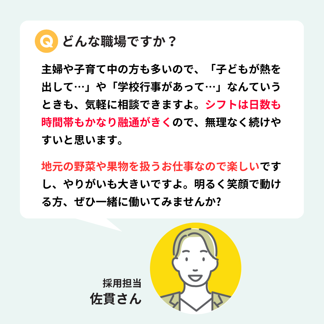 ・地元にUターン、Iターンで帰ってきた方もぜひ! ・長期休暇あり(GW、お盆、年末年始等)や、平日のみもしくは週末土日祝のみOKの職場もあります♪