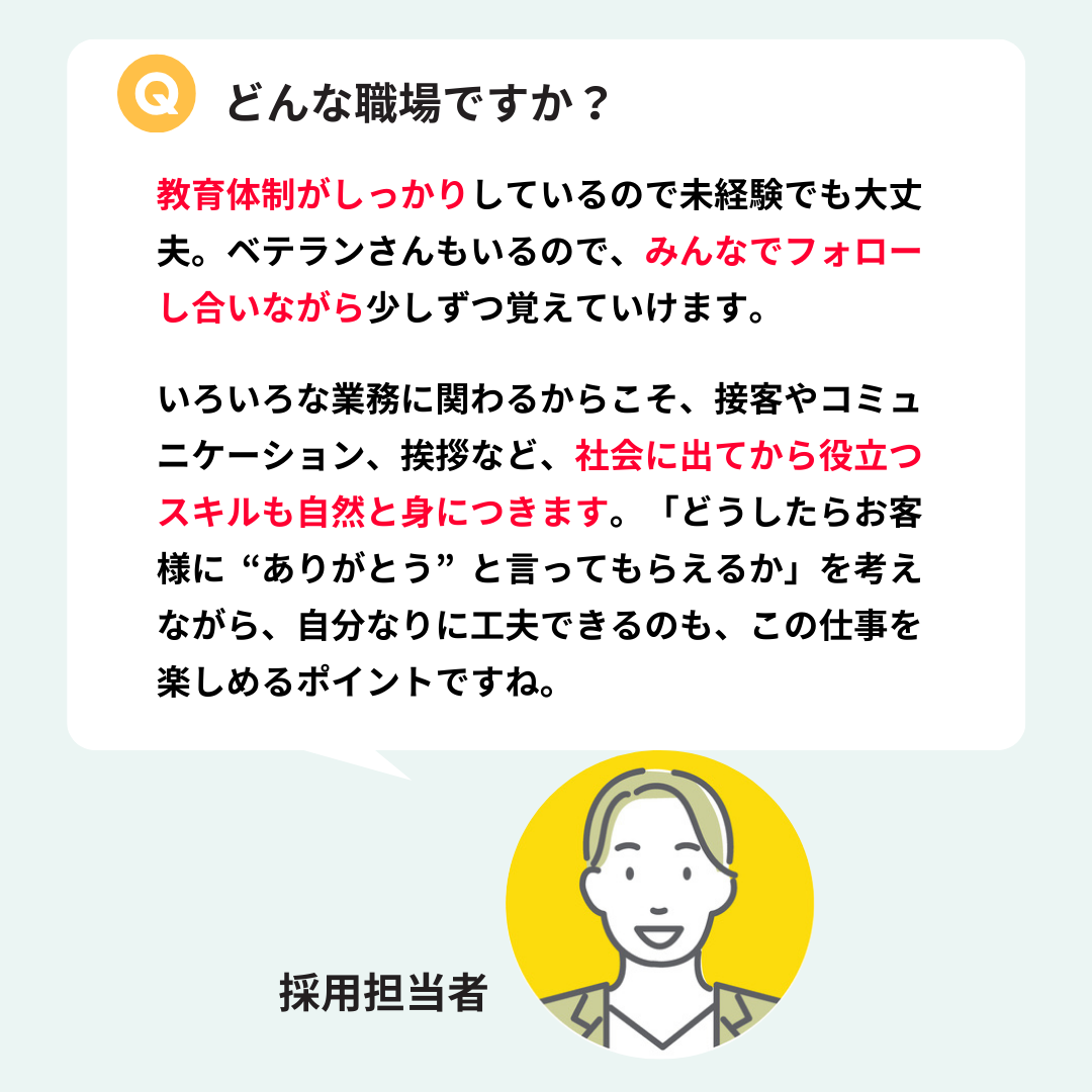 | 求める人材 | 未経験の方大歓迎 学生・主婦(夫)・フリーター活躍中 |