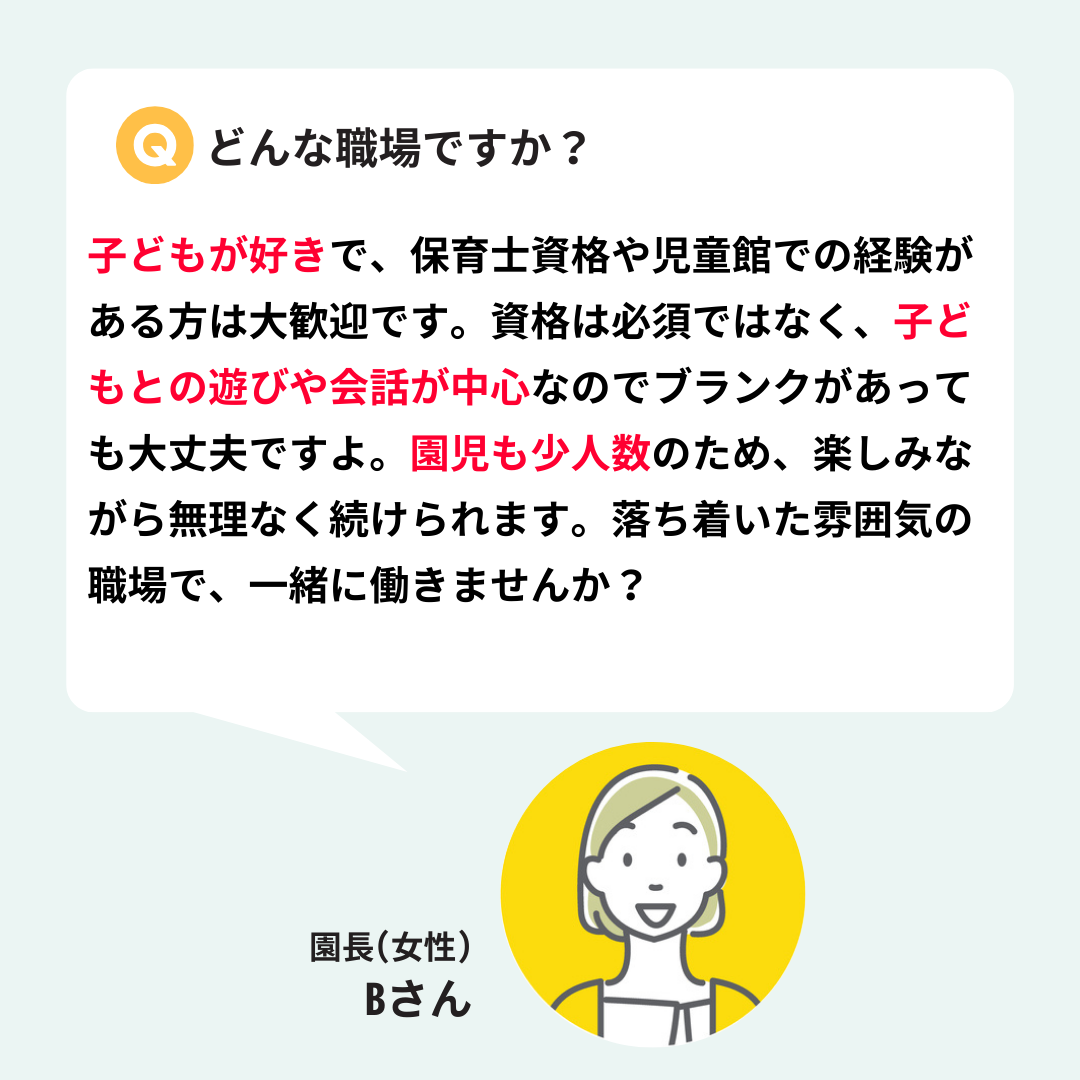 担任業務はなく、子どもたちとの遊びや会話が中心なので、久しぶりの仕事復帰でも安心です。落ち着いた雰囲気の中で、無理なく長く働ける環境です。