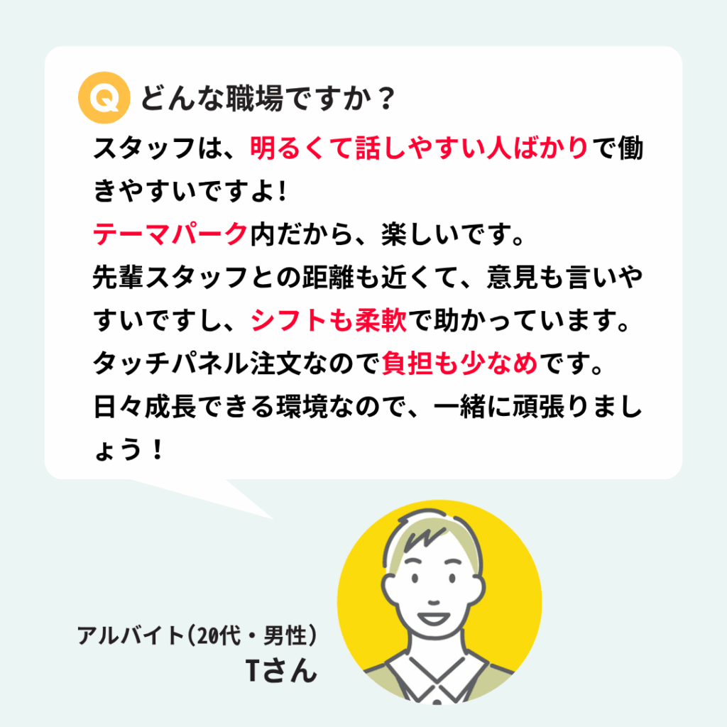 接客や調理が初めての方でも安心してスタートできる環境です。注文はセルフオーダー式なので、難しい接客はほとんどありません!